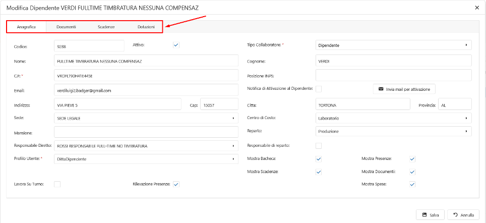 Accedendo al dettaglio di un’anagrafica dipendente, ora appariranno i tab “Anagrafica”, “Documenti”, “Scadenze” e “Dotazioni”, in questo modo è possibile accedere rapidamente a tutti i documenti, scadenze e dotazioni assegnati ad uno specifico dipendente:
