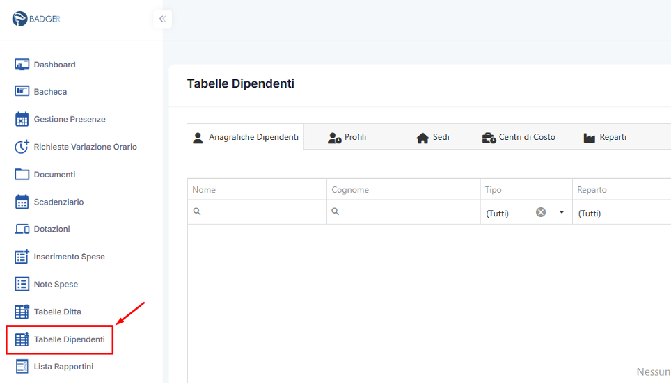 In questa sezione sono ora presenti i menu “Anagrafiche dipendenti”, “Profili”, “Sedi”, “Centri di Costo” e “Reparti”, che precedentemente erano visualizzati in “Gestione Presenze”.