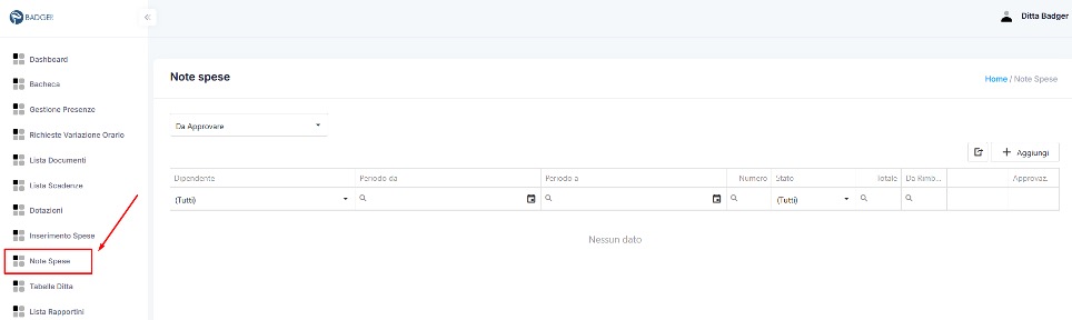 Dalla homepage di Badger, selezionare “Note Spese” dal menu di sinistra: