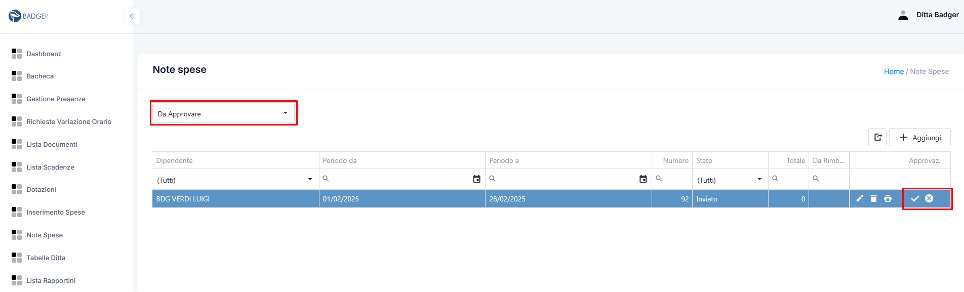 Le note spese con stato “Inviato” (principalmente emesse direttamente dai dipendenti) devono essere approvate dalla ditta prima dell’emissione effettiva, L’incaricato potrà quindi approvare la richiesta con un semplice click sul pulsante