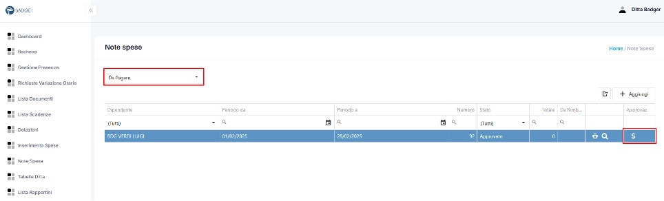 Le note spese con stato “Approvato” appariranno nel menu “Da pagare”, premere il tasto![]()