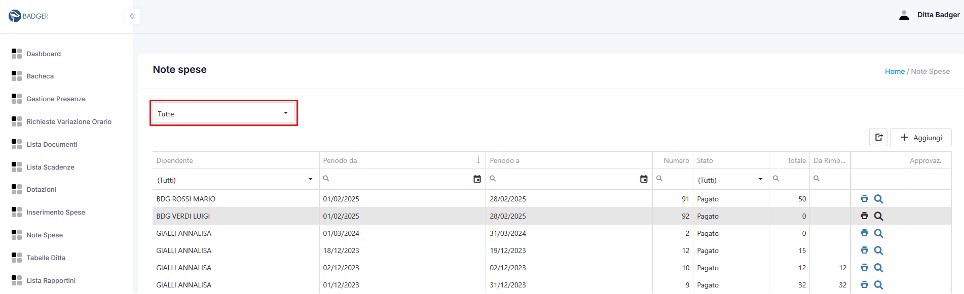 Le note spese già pagate appariranno nel menu “Tutte”, in modo da poter essere consultate ed eventualmente stampate.