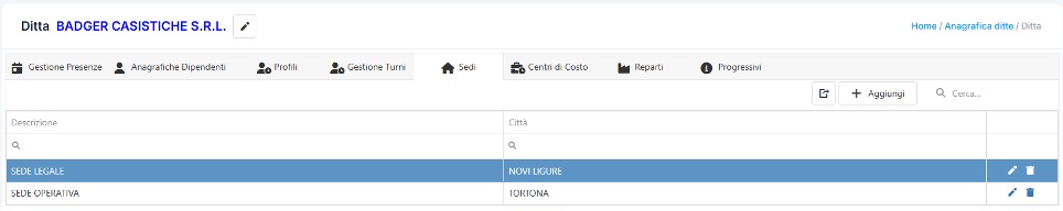 Da qui è possibile, tramite le apposite barre di ricerca, filtrare le sedi in base a Descrizione o Città, modificare i dettagli della sede selezionata premendo il pulsante
